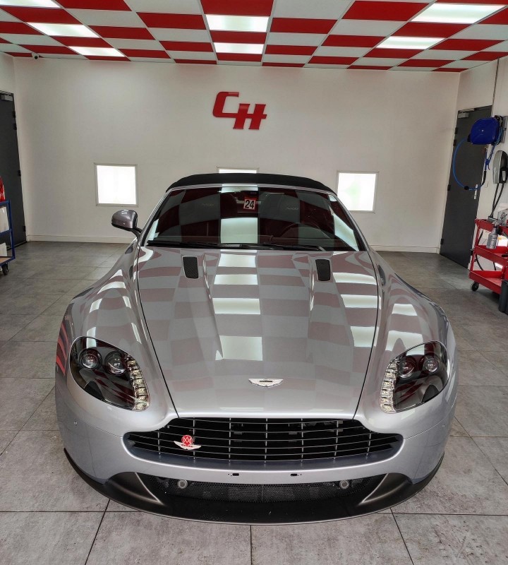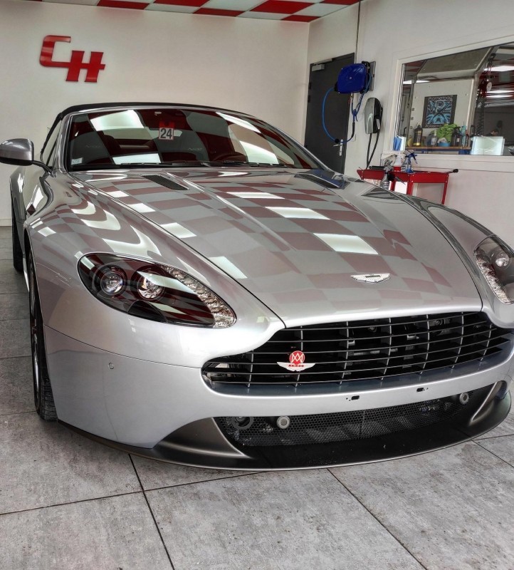 Pose d’un film de protection carrosserie PPF sur le bloc avant de cette Aston martin.