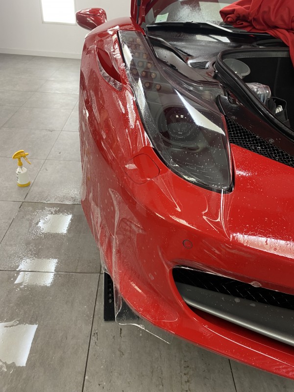 Application d’un film de protection PPF sur le pare-chocs avant de cette Ferrari 458 Italia.