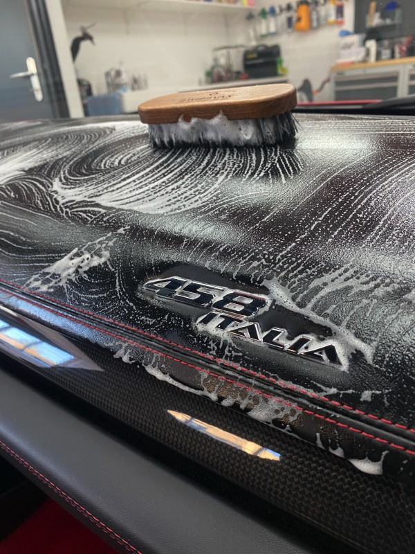 Nettoyage et traitement des cuirs anti UV sur cette Ferrari 458 Italia.