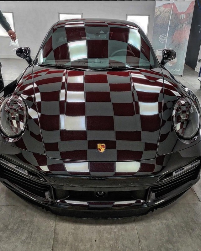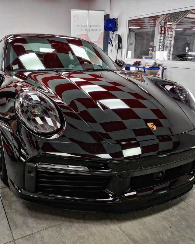 Pose d’un film de protection carrosserie PPF ceramique sur le bloc avant de cette Porsche 911.
